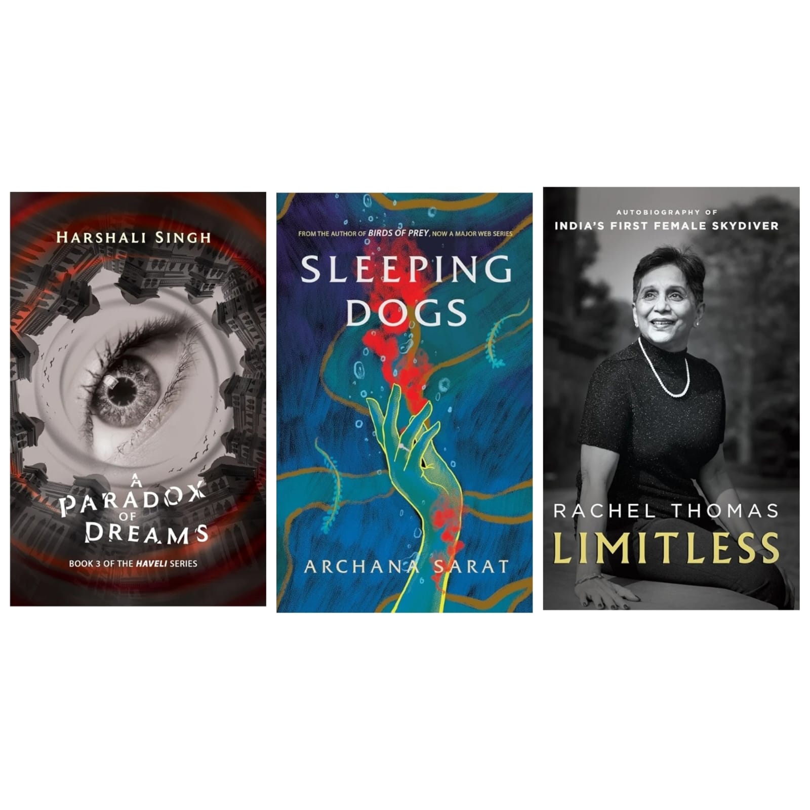 A Paradox of Dreams by Harshali Singh; Sleeping Dogs by Archana Sarat; Limitless: Autobiography of India's First Female Skydiver by Rachel Thomas