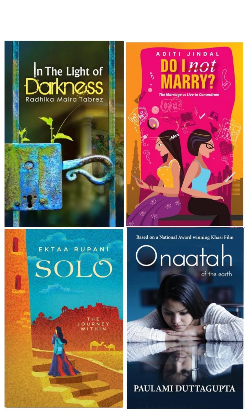 In the Light of Darkness by Radhika Maira Tabrez; Do I NOT Marry? — The Marriage vs Live-in Conundrum by Aditi Jindal; Solo by Ektaa Rupani; Onaatah by Paulami DuttaGupta
